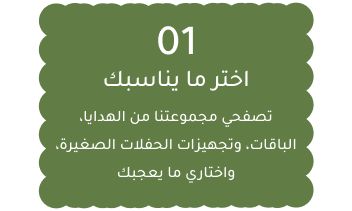 هدايا مميزة تُعبّر عن مشاعرك، وتجهيز حفلات صغيرة مُنسّقة بعناية لتكون كل مناسبة استثنائية، وتصاميم وطباعات حسب الطلب تضيف لمسة شخصية فريدة تجعل كل لحظة مليئة بالفرح والسعادة والذكريات التي تدوم